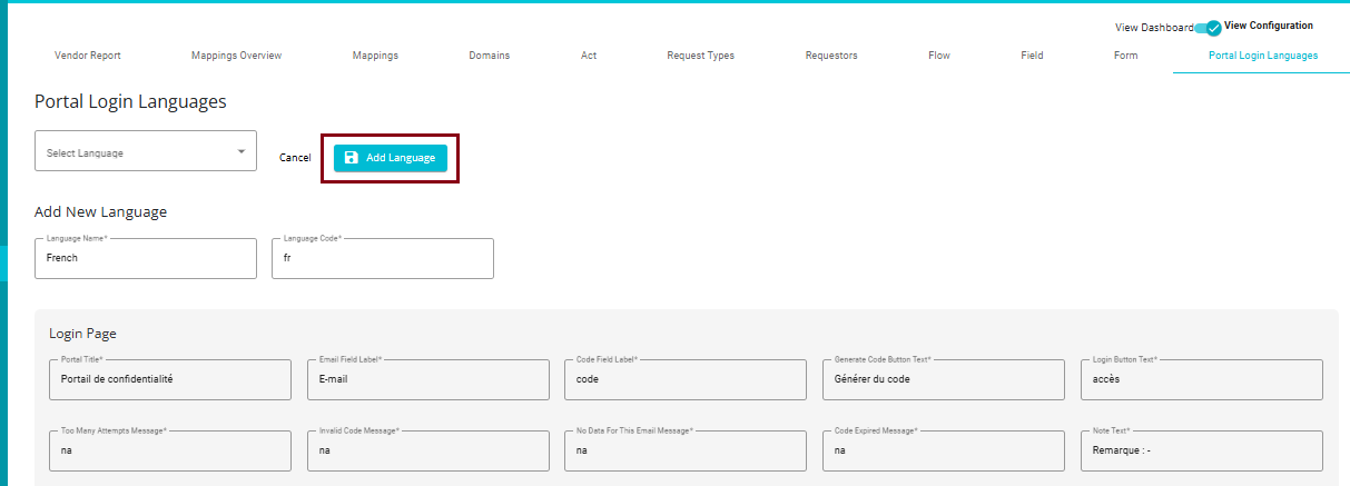 • Navigate to the "Portal Login Languages" Tab on the View Configuration page.