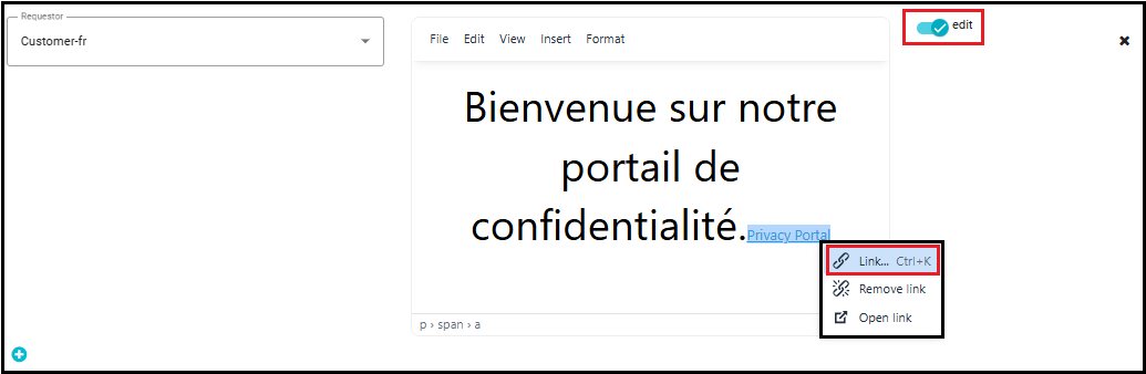 • If the link is placed in the header, first enable the "Edit" toggle, then right-click on "Privacy Portal" to make the necessary changes.