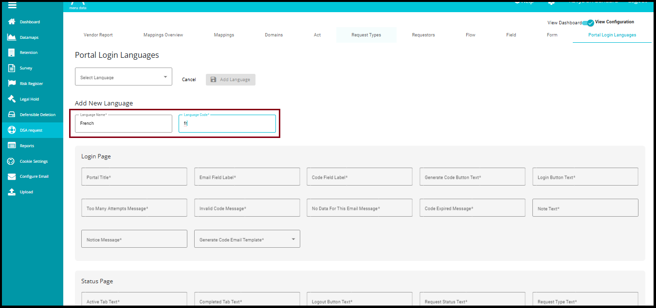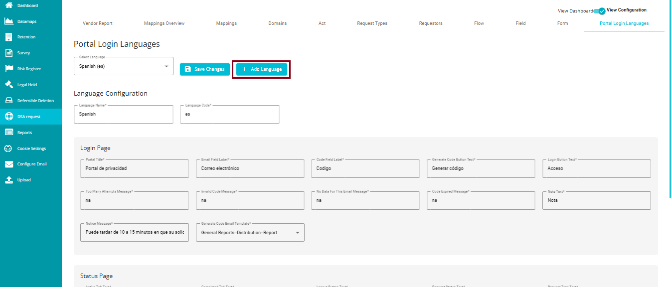 The Portal Login Languages feature allows users to switch the language of the DSAR (Data Subject Access Request) portal login interface, making it easier for individuals to navigate and understand the content in their preferred language. This is especially helpful when users want to check the status of their submitted requests. By enabling multilingual support, the portal ensures that users from different linguistic backgrounds can access and interpret their request information without confusion or the need for external translation tools.