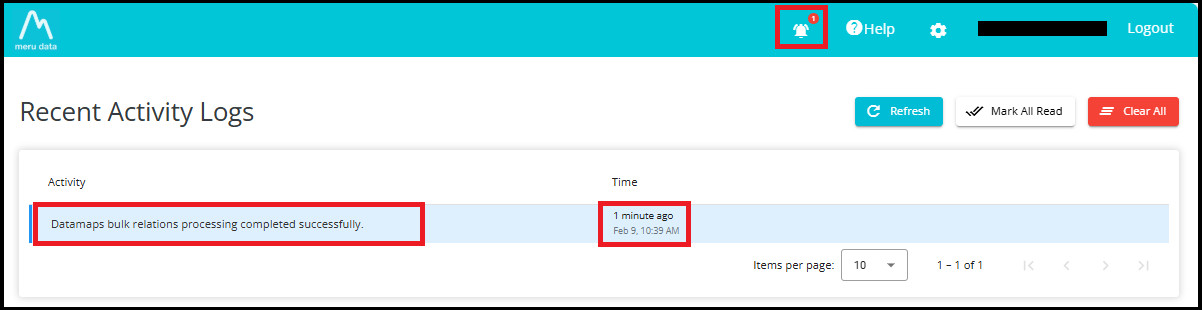 Example: If your bulk update is still processing, clicking Refresh may show a new entry such as "Datamaps bulk relations processing completed successfully."