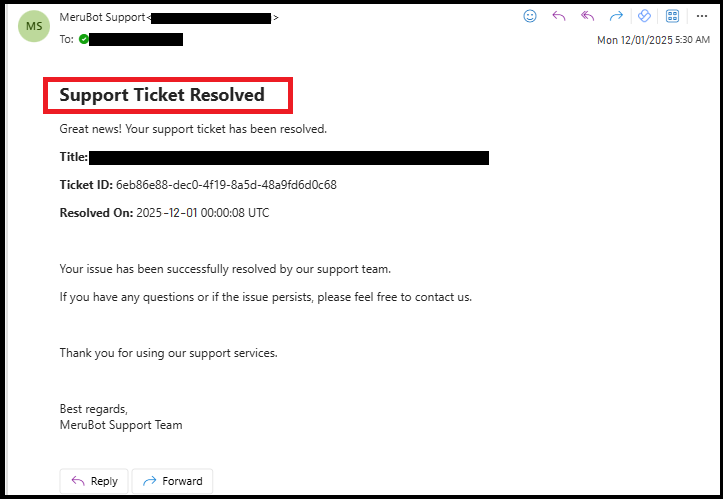 • Once the issue is resolved, you will receive an email notification confirming that your support ticket has been successfully closed. The email includes: