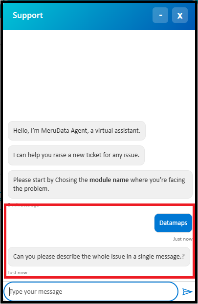 • After clicking the Support button, the MeruData Agent, a virtual assistant will open on the right side of your current page, allowing you to interact and raise a ticket for any issue.