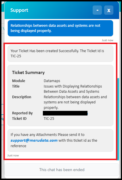 • If you have any attachments related to the issue, you can send them to "support@merudata.com" using the Ticket ID as a reference. Please note that files cannot be attached directly in the chat, so we provide this email address for submitting any supporting documents.