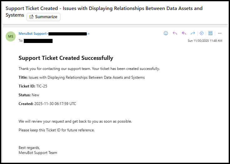 • Once you provide the issue details, the Meru Bot will automatically create a ticket for your query. A confirmation message will appear along with a Ticket Summary, which includes: