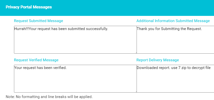 Request Submitted Message -- this message is displayed to the user right after the user submits a DSA request through your privacy portal.