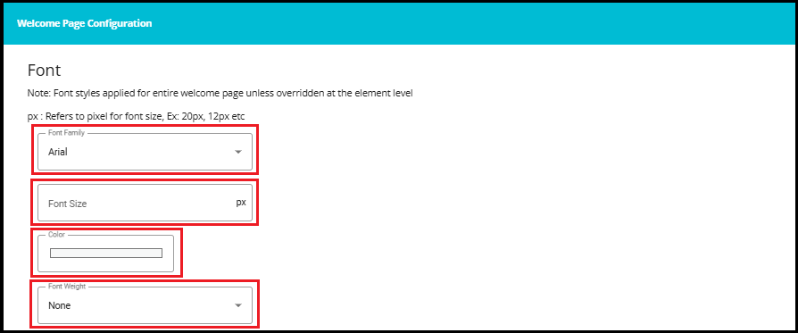 Note: The configurations made under Welcome Page Configuration apply to the entire text displayed on the Privacy Portal welcome screen by default. These settings can be overridden at the individual level if specific styles are defined under Header, Title, or Subtitle sections.