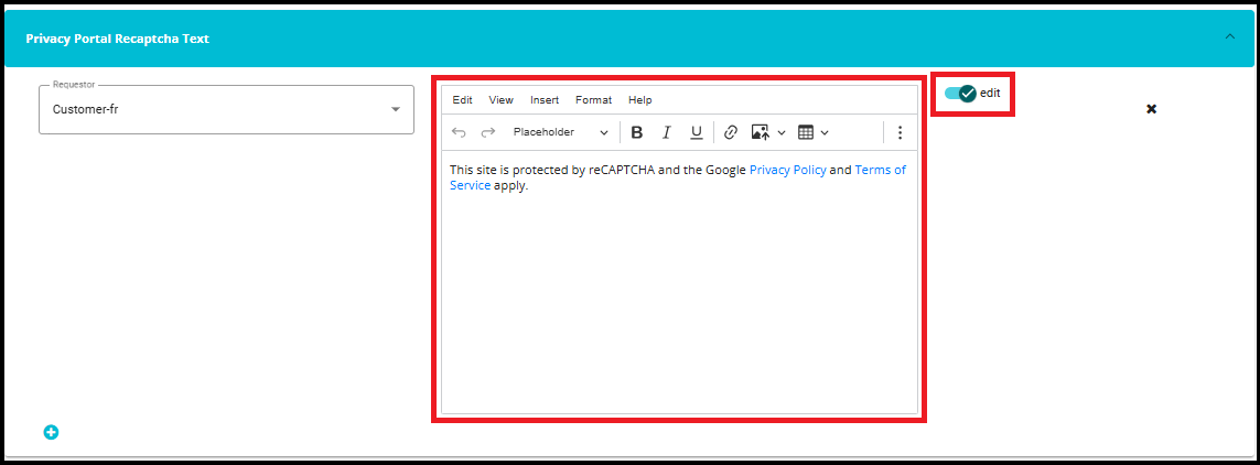 • Click on the "+" icon to configure the Recaptcha text that will appear on the Privacy Portal Welcome Screen for the selected requestor type.