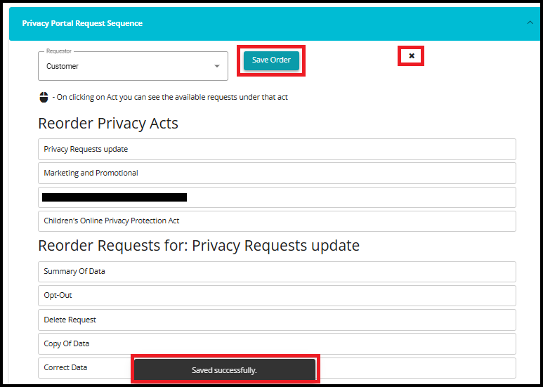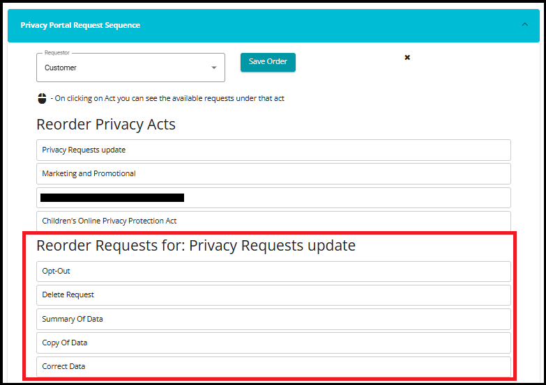 • This feature allows you to control the order in which different Privacy Acts and their corresponding Privacy Requests appear for each Requestor Type (Employee, Customer, Vendor, etc.).
