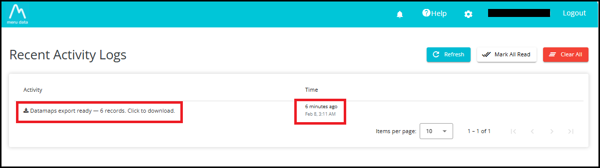 In the Activity Logs section, you will see an entry showing that the export is ready.