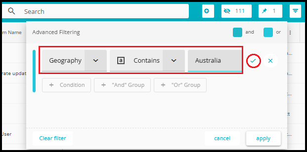 - In the Advanced Filtering interface, if you want to change or modify an existing condition (e.g., Geography Contains Australia), you can do so by clicking the edit symbol next to the condition. This allows you to update the column, filter, or value as needed.