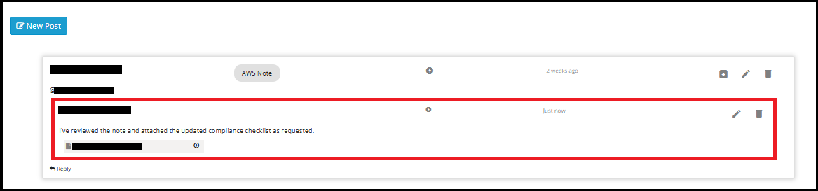 To reply to a Note/Task as a tagged user, click on the Reply button located below the note or task. This opens a comment input box.