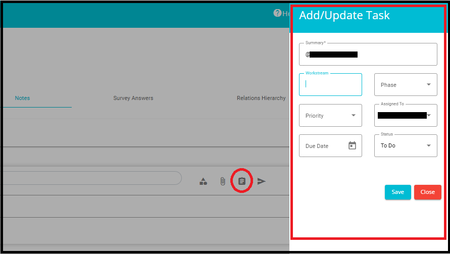 - Once the task has been configured, click Save or click on Send icon to post the Note.